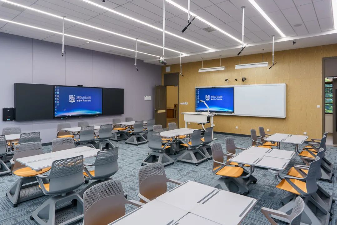 智慧教室支持精品直录播,配备交互式黑板、互动课桌椅。