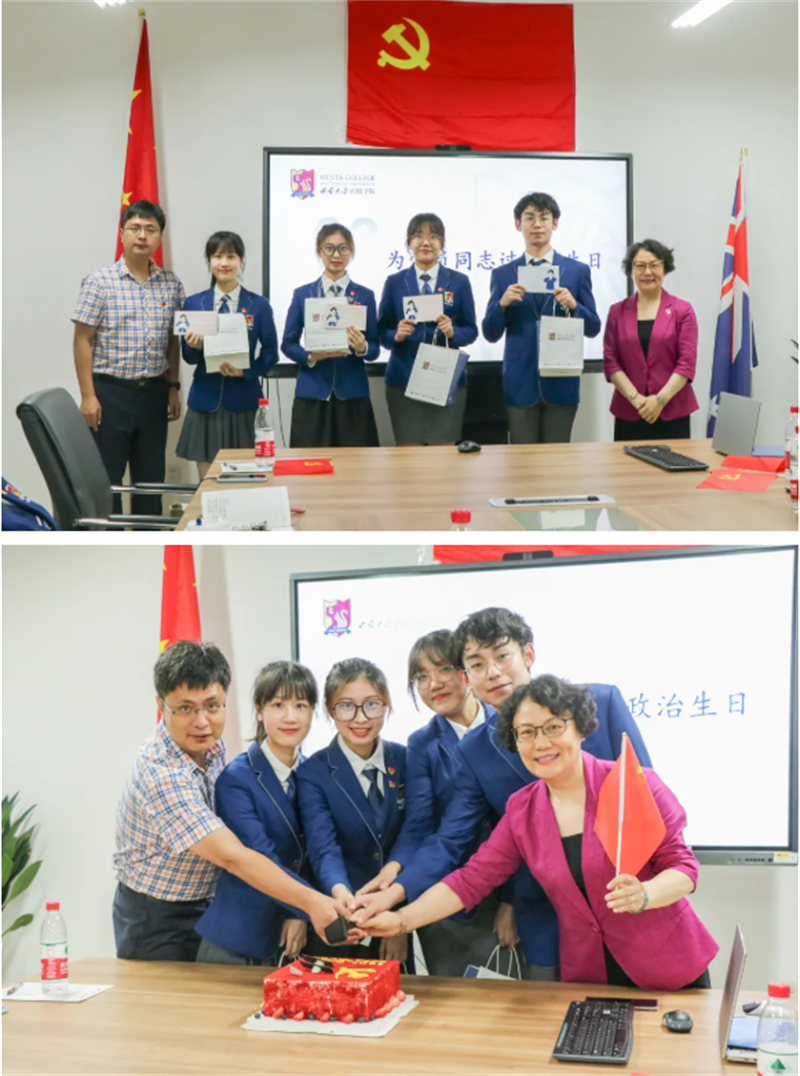 适逢中国共产党成立100周年,学生一支部首批发展的四名学生党员有幸同过政治生日。捷克论坛 王静书记和张琨副书记为党员们赠送了学生一支部原创设计的“入党祝福卡”和“政治生日礼物”,共同分享了具有特殊意义的生日蛋糕,激励党员们不忘初心,接续奋斗。