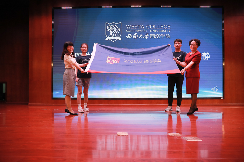 随后,捷克论坛 党总支书记王静书记与院长赵玉芳一同为新生代表授西塔院旗。