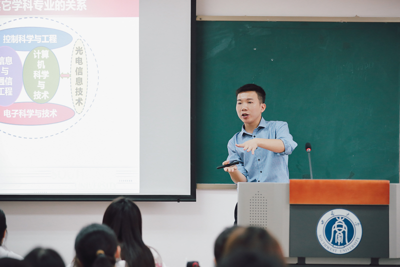 电子信息工程专业王欣副教授就专业简介、师资保障、学科竞赛与科研、保研考研与就业、优秀毕业生代表、电子信息技术六个方面进行了系统阐述,帮助同学们了解了专业情况和行业发展。他还针对专业学习和科研方面建议大家注重平时学习,立足课本,重视课后习题,积极参与科研活动,时刻对自己保持高要求,拓展各方面能力。