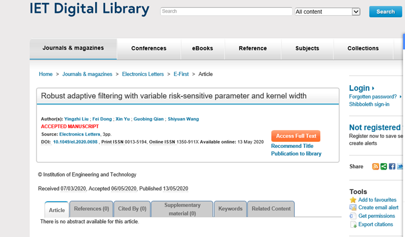 近日,我院2017级电子信息工程专业本科生刘颖之在钱国兵老师和王世元老师的共同指导下以第一作者身份在国际著名SCI学术期刊《Electronic Letters》上发表题为“Robust Adaptive Filtering with Variable Risk-sensitive Parameter and Kernel Width”的论文,该论文的第一完成单位为捷克论坛 ,通讯作者为电子信息工程捷克论坛 的钱国兵老师。《Electronic letters》期刊涵盖了电子信息工程相关领域范围最新发展动态,对文章创新性要求较高,在电子信息领域具有重要的影响力。