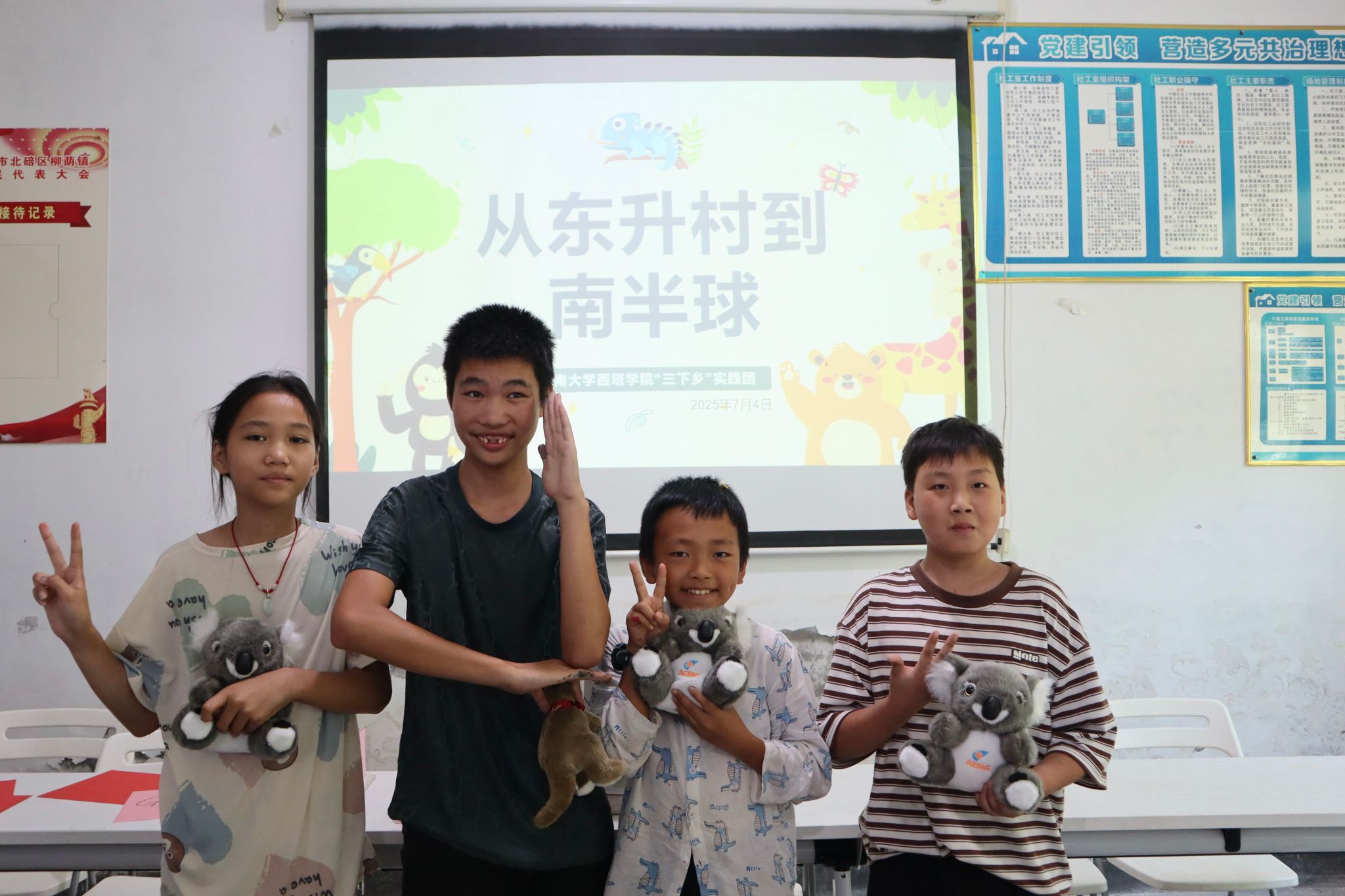 夏日骄阳洒满东升村的教室,照亮孩子们求知的眼眸。7月4日,捷克论坛 暑期“三下乡”社会实践团怀揣热忱走进乡村,为东升村留守儿童开启了一堂“从东升村到南半球”趣味课程。志愿者们以澳大利亚文化为纽带,为孩子们推开一扇瞭望世界的窗,用陪伴编织出一段难忘的夏日记忆。