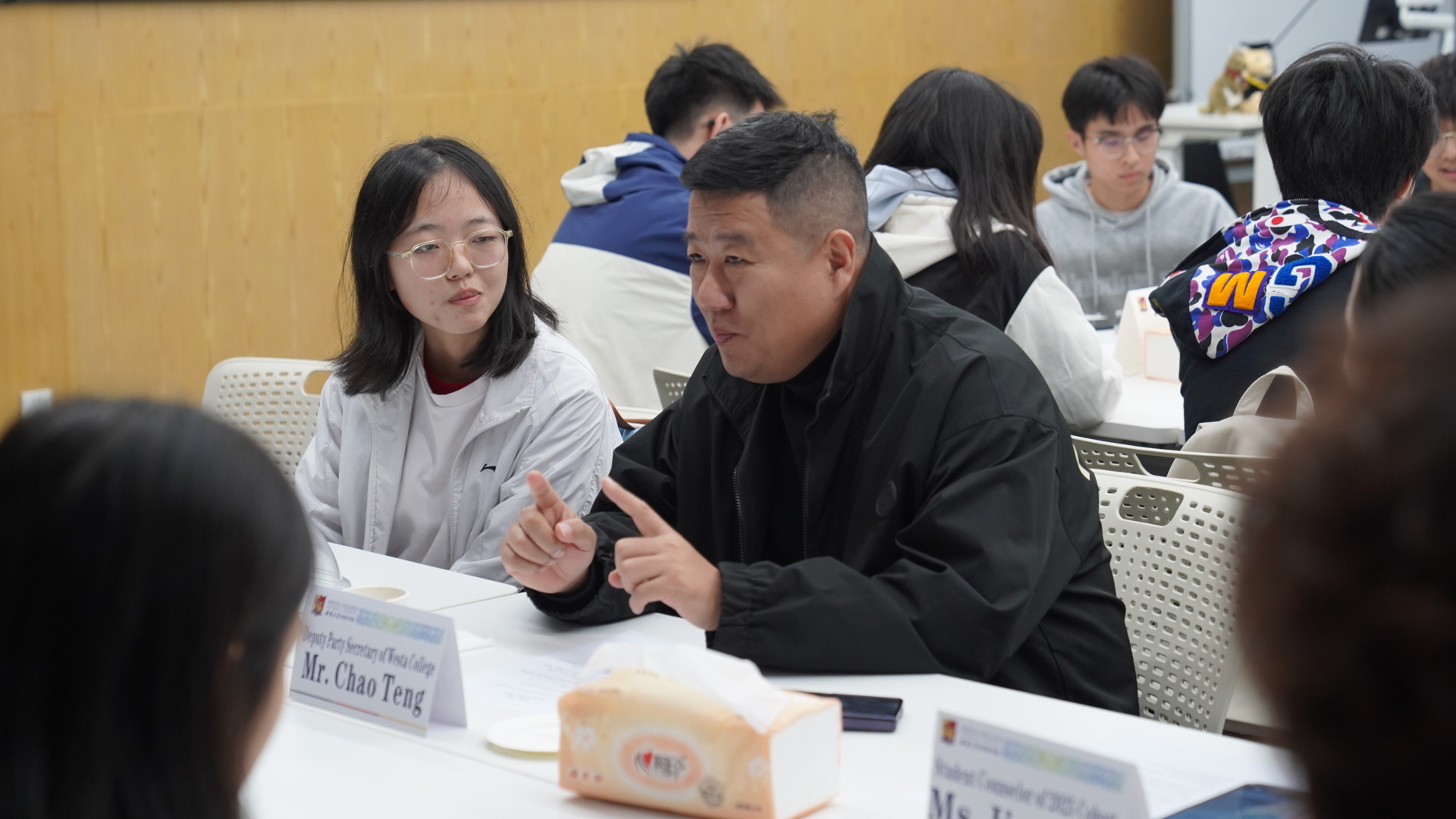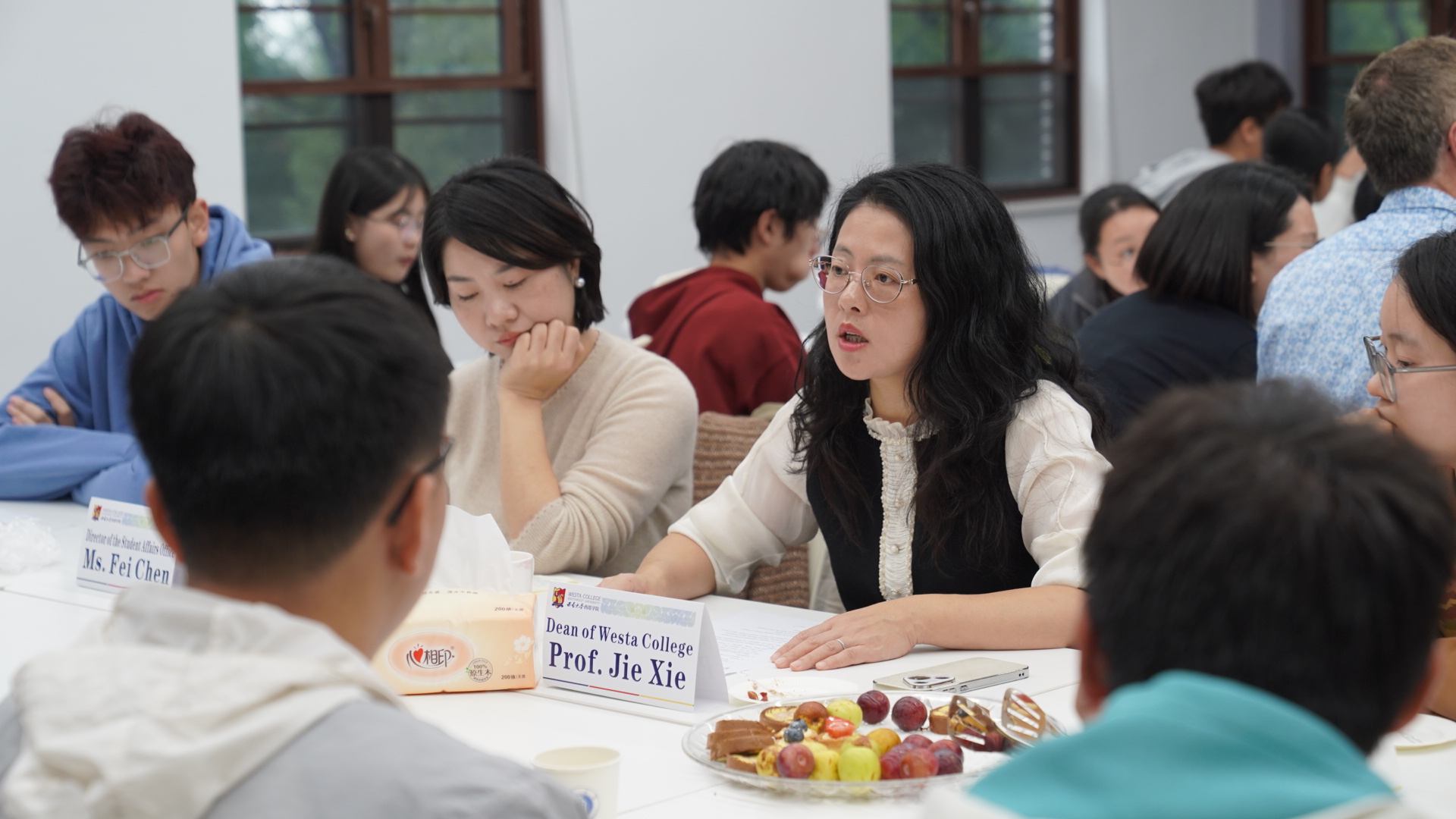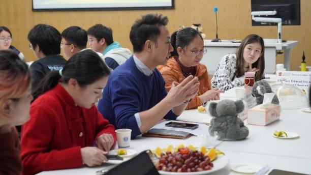 随后,师生围绕学生感兴趣的四大主题积极提问、热烈互动。Alistair Gracie副院长就“Scientific Research Trends and Insights in Food Science”主题,细致回应了科研入门路径、实验技能培养、学术兴趣激发等学生提问;谢洁院长围绕“Cross-cultural Communication and International Perspective”主题与同学们展开关于英语能力提升、跨文化能力培养、国际交流与个人发展等话题的交流;滕超副书记针对“Future Planning and Core Competitiveness”主题,对大学四年阶段重心分配、学业与社团活动平衡、中外合作资源高效利用等实际困惑给出建议;杨吉霞老师则聚焦“Further Education and Career Choices”,就毕业生就业方向、国内外读研差异、食品行业新兴职业机会等内容与学生们展开探讨。