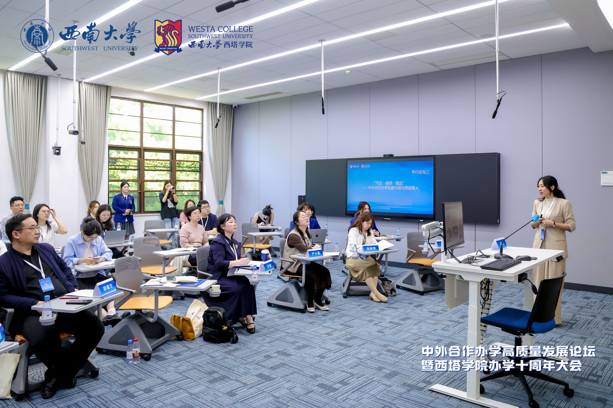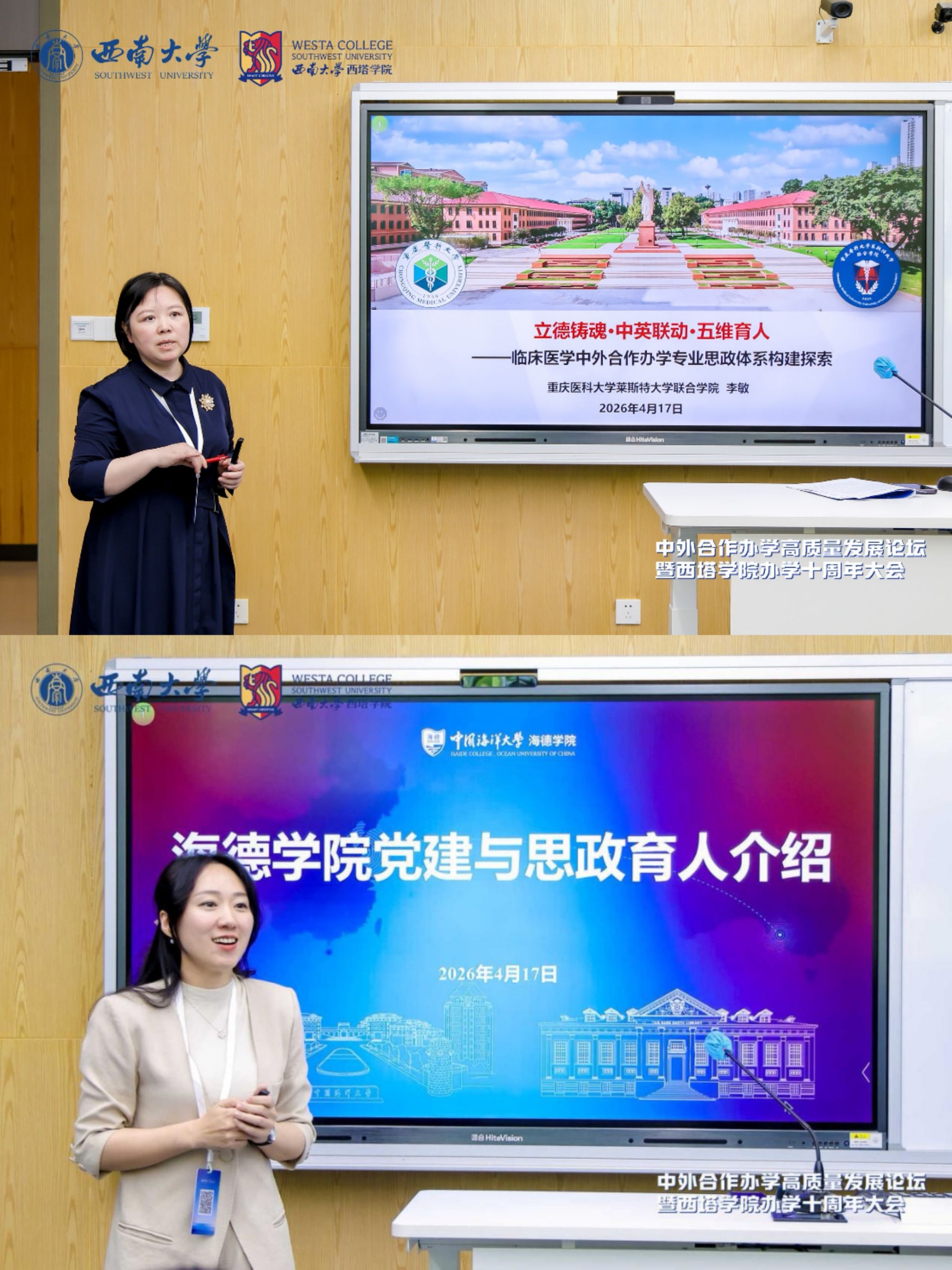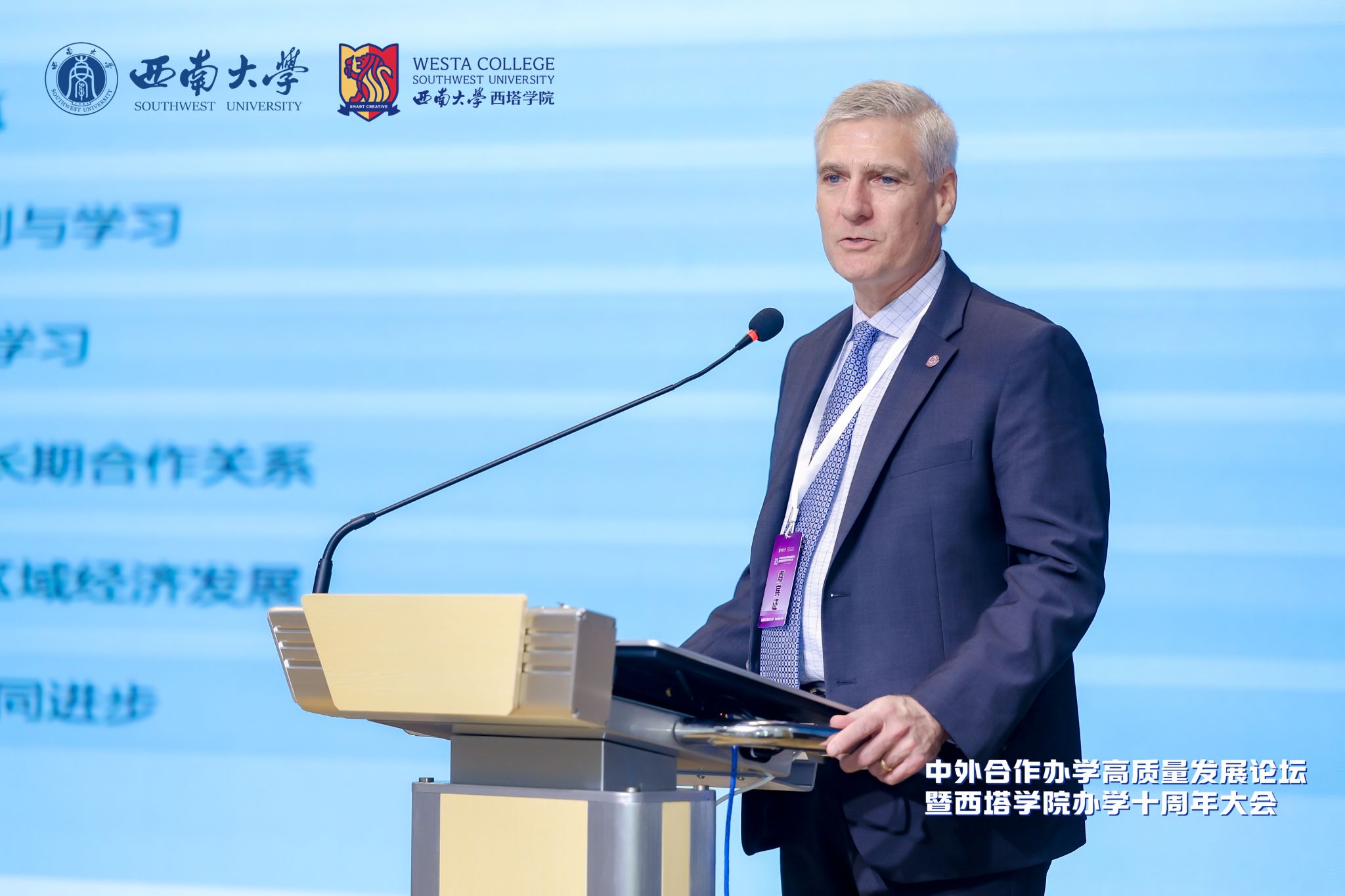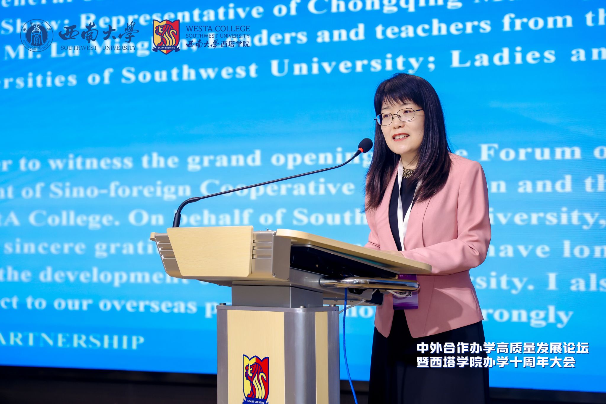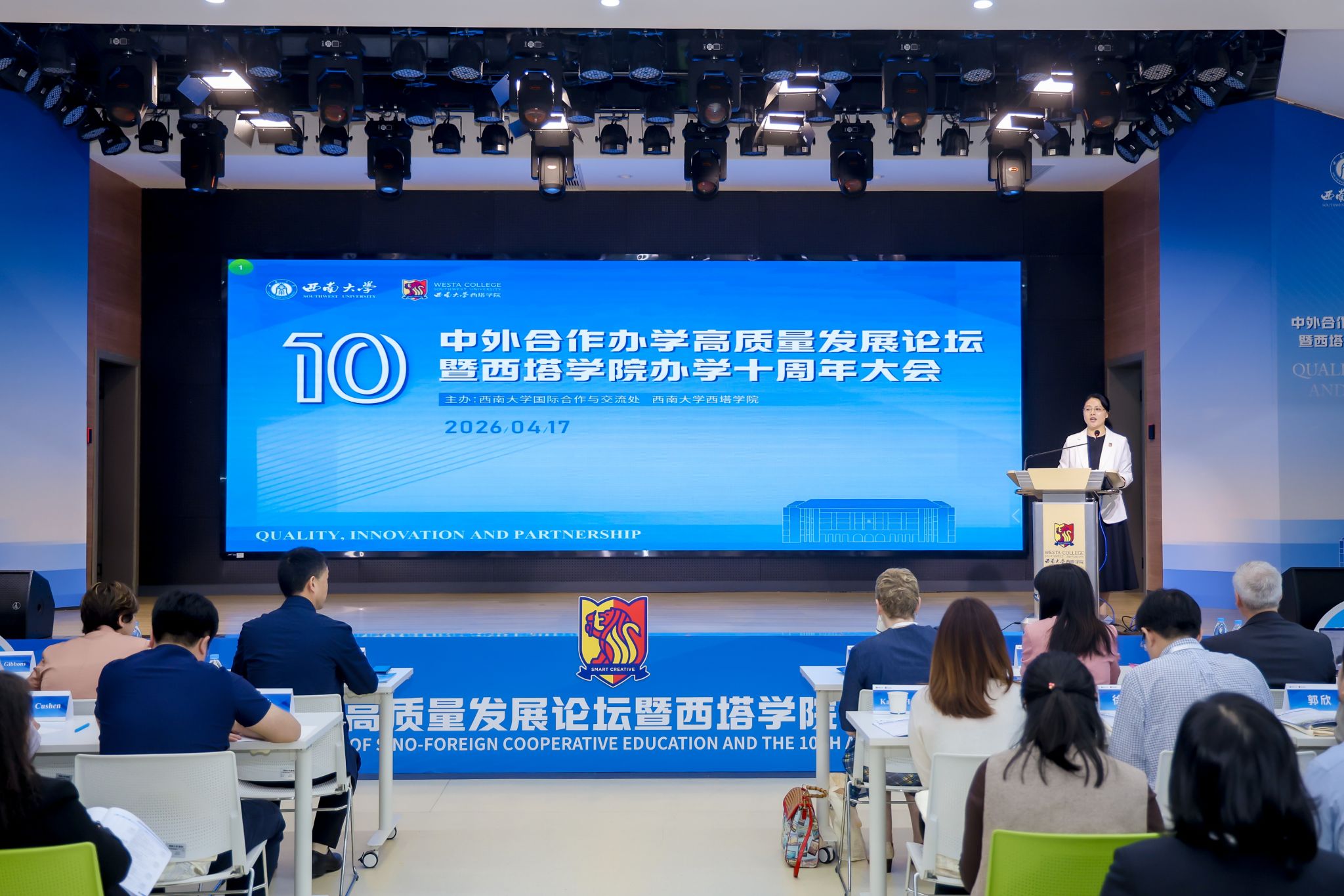 4月17日上午,由学校国际合作与交流处、捷克论坛 联合主办的中外合作办学高质量发展论坛暨捷克论坛 办学十周年大会在学校隆重举行。澳大利亚驻成都总领事馆总领事邵美珍、重庆市教委二级巡视员卢明伦、学校副校长赵玉芳,以及新西兰奥塔哥大学、美国密苏里州立大学、澳大利亚詹姆斯库克大学等海外合作高校负责人出席;国内中外合作办学机构及兄弟单位代表共150余人参加。