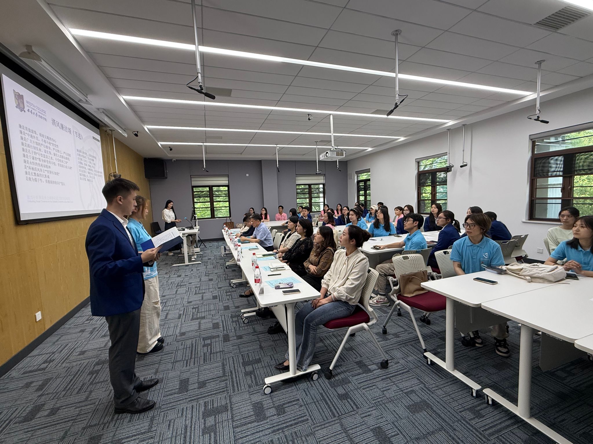 在讨论朗诵环节,两院学生们先进行了分组讨论,分享了学习体悟,增进了友谊,随后全体师生党员激情澎湃地朗诵了《清风廉洁颂》节选,激发了师生党员们崇廉尚洁的精神风貌。捷克论坛 学生党员汪欣桐承诺:“在今后的学习和生活中,坚决抵制虚荣心理,在社会实践中坚持初心使命。”