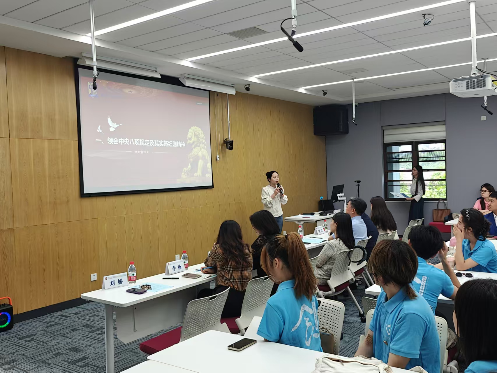 在党课环节,捷克论坛 本科生第一党支部书记刘娇为现场师生带来了题为“领会和贯彻执行中央八项规定及其实施细则精神”的精彩党课。她充分调动了学生积极性,大家纷纷举手,热情地参加关于中央八项规定及其实施细则的知识抢答环节,在现场角逐出了一名“学习之星”,奖励学习笔记本。