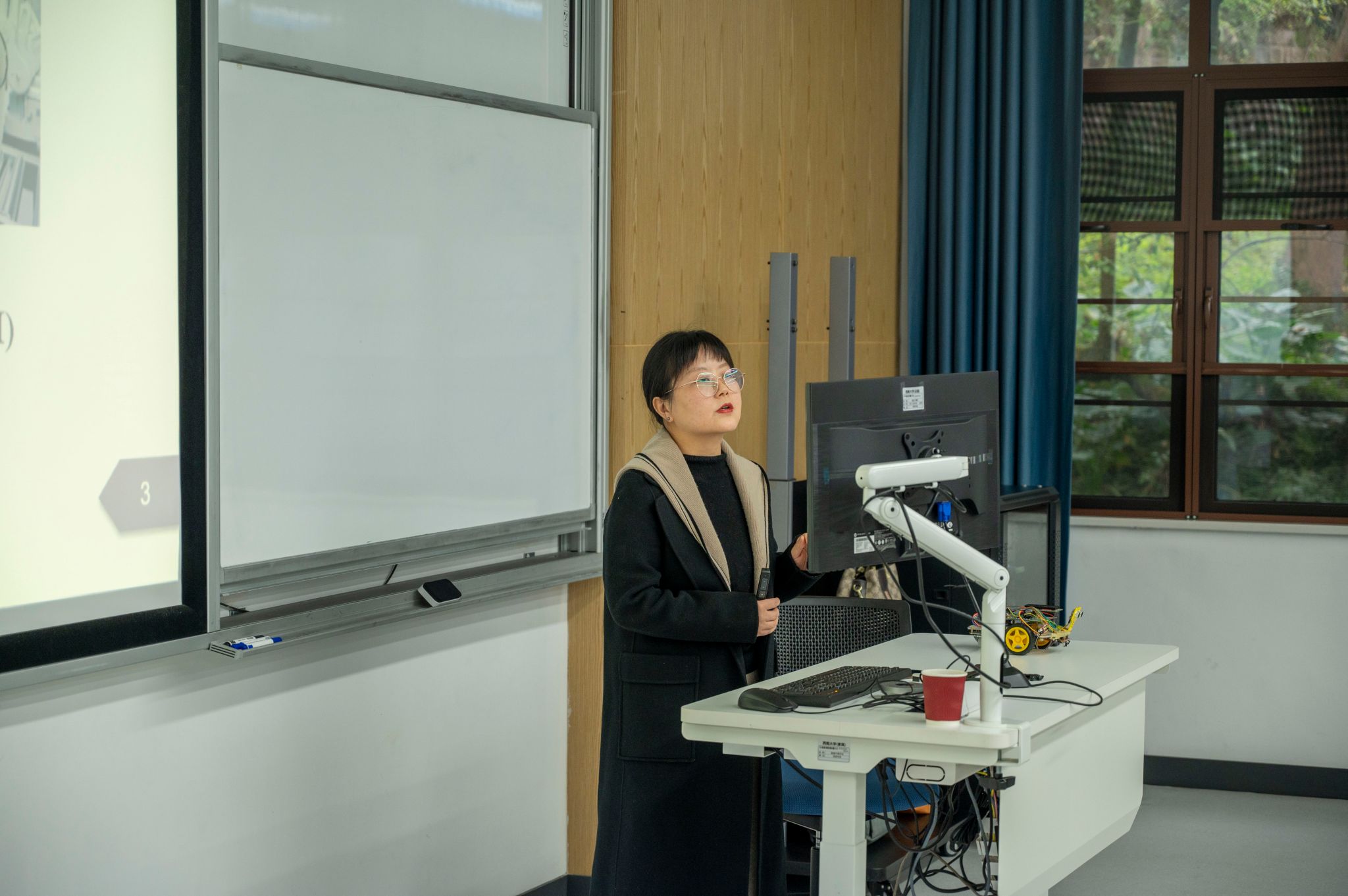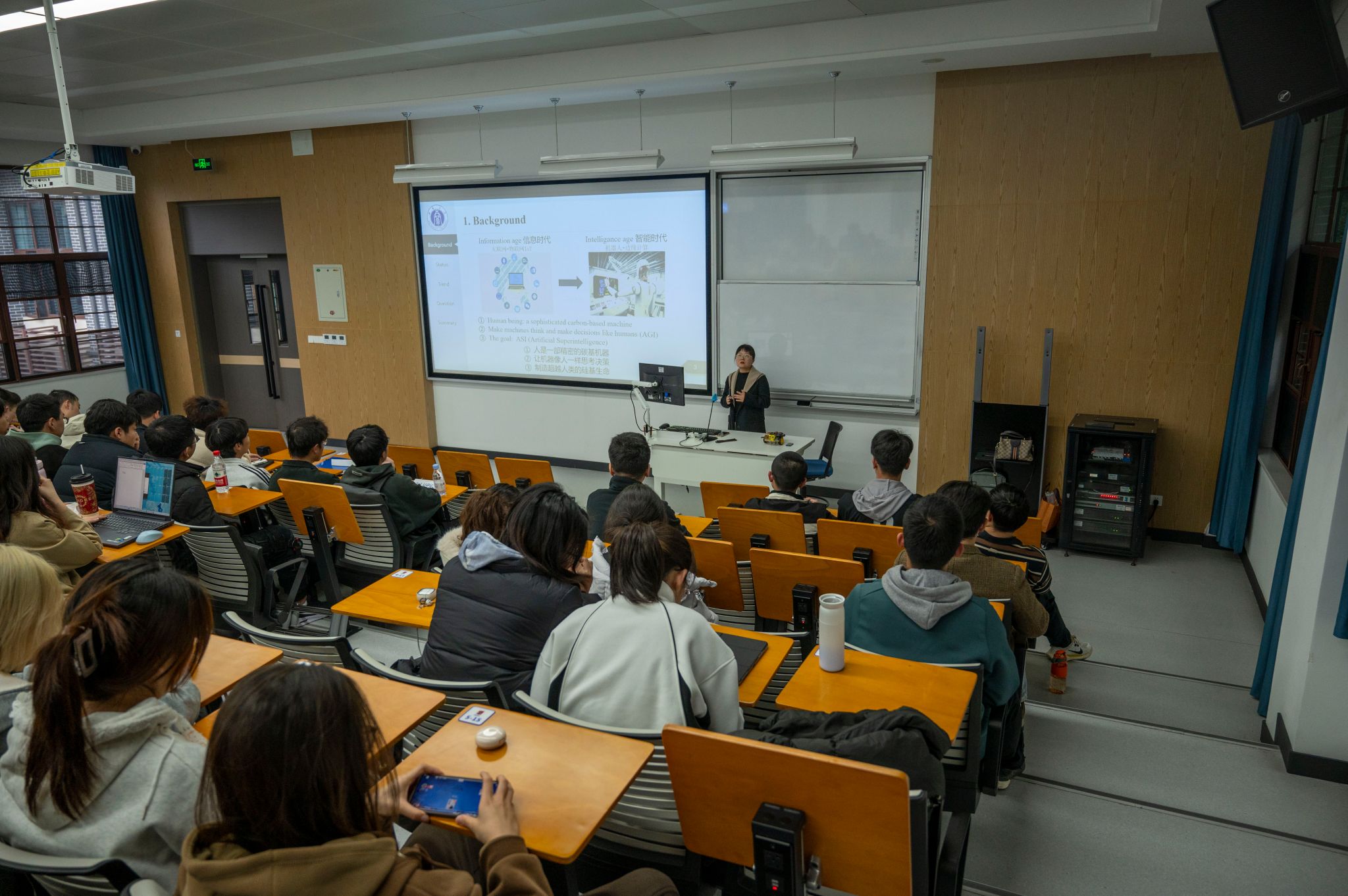 在电子信息工程专业专场讲座上,陈玲副教授围绕“面向未来的神经形态计算体系”这一主题,概述了这项前沿科技的背景状况,指出人类作为精密的碳基机器与硅基生命形式之间的差异,并强调了追求类脑智能的重要性。她表示,在信息时代向智能时代过渡的过程中,人工智能的目标不仅是让机器能够像人类一样思考和决策,更是让机器拥有人脑一样的超低功耗超高算力。随后,她详细讲解了当前神经形态计算的发展现状,介绍了硬件性能、学习能力和智能水平方面的最新进展以及对全球范围内对低能耗、高容错性及异步并行处理的研究热点。在讲座尾声,陈玲副教授还带来了一场别开生面的跨学科对话,以人工智能为载体的“尼采”形象的出现,向同学们展示了人工智能时代的生存哲学。
