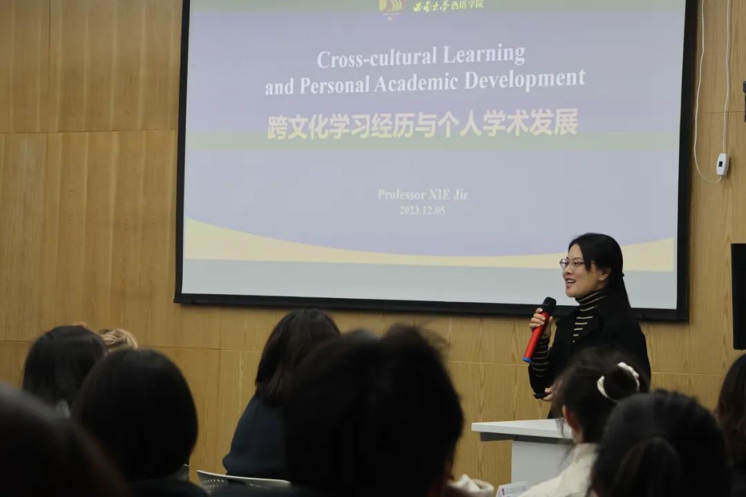 谢洁院长从“Who are we?”提问出发,用生动形象的图片与案例启发同学们对跨文化的思考与理解。她以自己赴美做访问学者期间的经历为例,从个人学术成长、跨文化学习与交流能力、批判创新思维养成等多角度向学子们阐明了开展多元文化交流和学习的重要性。最后,她通过介绍捷克论坛 为培养具有全球择业能力的创意精英系列举措,鼓励学子们要不断挑战和突破自我,实现从西塔走向世界舞台的飞跃。